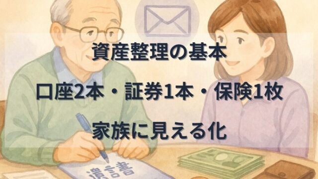 お金の整理 資産が一目でわかる!口座2本・証券1本・保険1枚のはじめ方 通帳や保険がバラバラだと家族が迷います。口座2本・証券1本・保険1枚に整理する「資産の見える化」で、二重払い防止と相続準備を進めましょう。 2025.09.01 お金の整理相続・お金・手続